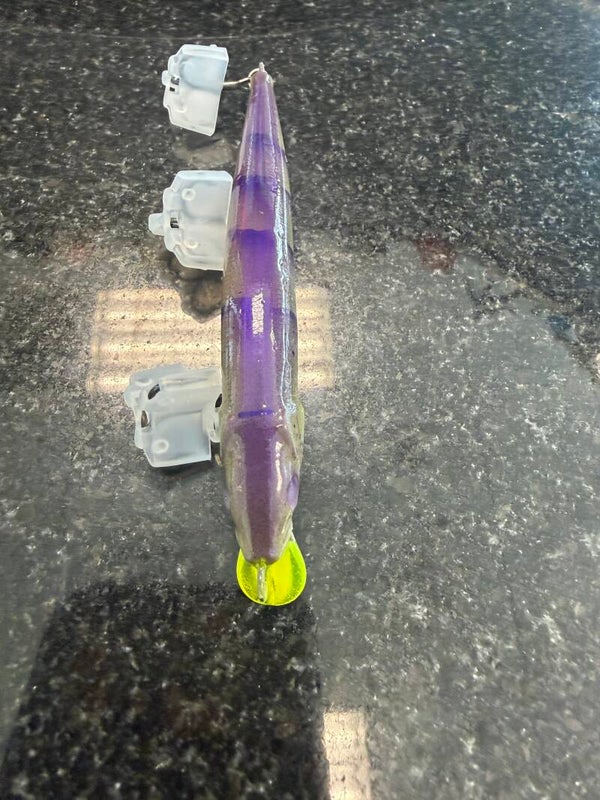 Another amazing paint job by finger print offering the 110 jerk bait in his famous Noen Marshmellow , this sell out fast, go get some !!!!
